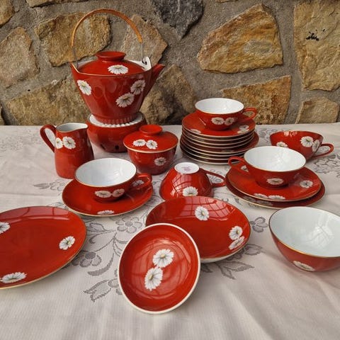 Et raffineret bordservise af porcelæn fra Noritake, en historisk japansk fabrik internationalt anerkendt for kvaliteten af sin produktion og for elegancen i sine dekorationer. Serviset prægæs af det sarte blomster-motiv Anita, kendetegnet ved små buketter af lyserøde blomster og stiliserede bladdetaljer, harmonisk fordelt langs kanten af elementerne. Dekorationen, sober og romantisk på samme tid, er omkranset af tynde linjer, der definerer konturen med stor balance, hvilket giver helheden en feminin, strålende og tidsløs æstetik, der perfekt repræsenterer Noritake-smagen i anden halvdel af det tyvende århundrede.