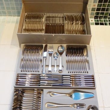 Spisesæt med 12 knive, 12 gafler, 12 spiseskeer, 12 kaffeskeer, 12 kagegafler, dernæst 1 suppenkelle, 1 saucekelle, 2 grøntsagsskef, 2 kødgaffler, 1 kagegaffel, 1 flødeske, 1 sukkerske.