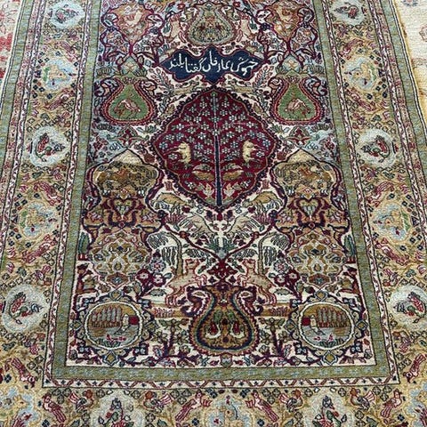 Et exceptionelt håndlavet tyrkisk Milas-tæppe i uld i rumstørrelse, der måler 335 x 240 cm. Arts and crafts-design med lyse turkis/himmelblå linjer kombineret med teglrøde kanter samt ottekantede rosetter med hægtede motiver i stiliserede blomstertræformer med smukke farvepaletter overalt. Designet ses i antikke Ushak-tæpper fra regionen, men vævningen indikerer, at tæppet er Milas. Designet er dog meget sjældent, mere set i Arts and crafts-tæpper fra William Morris. Tæppet er i perfekt stand og har været opbevaret. Bemærk venligst, at da disse tæpper er opbevaret på lager og forseglet for at beskytte dem mod mølskader osv., kan de have en smule grumset eller opbevaret lugt ved opbevaring, men når de åbnes ved stuetemperatur og står i en dag eller to, vil det være fint! Et meget smukt tæppe kommer sjældent på det åbne marked, da de fleste