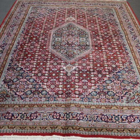 Bidjar tæppe fra Indien, håndknyttet, 100% uld på bomuld, rød, 314 × 219 cm, produceret i slutningen af det 20. århundrede, ca. 250.000 knuder, generelt i god stand med brugsspor. Klik på den blå "gå til varen" knap, for at købe eller byde på denne vare. Den samlede pris vil blive vist inden du afgiver dit bud.