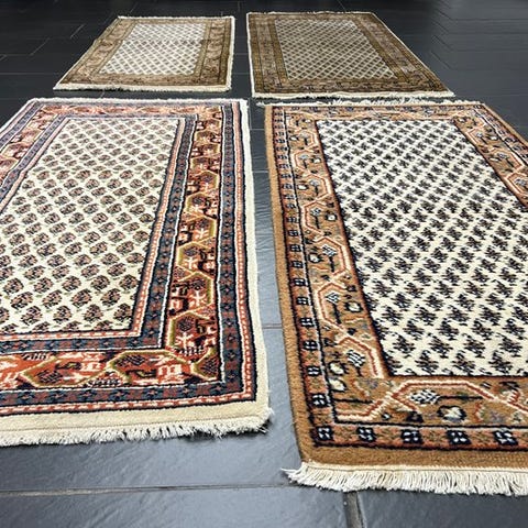 Sarough Mir 6-stykker håndvævede tæpper fra Indien, uld på bomuld, størrelserne 60×90 cm, 85×60 cm, 145×70 cm, 140×70 cm, 145×70 cm og 140×70 cm, dateret til slutningen af det 20. århundrede, i god stand med alders- og brugsspor. Klik på den blå "gå til varen" knap, for at købe eller byde på denne vare. Den samlede pris vil blive vist inden du afgiver dit bud.
