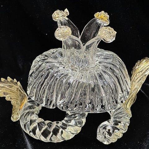 Værket er udført i glasrør og blæst glas, beriget med raffinerede indlæg i guldblad, der giver lys og farvedybde. Arbejdet fremhæver det høje muranesiske håndværk, med perfekt balance mellem form, gennemsigtighed og dekoration.