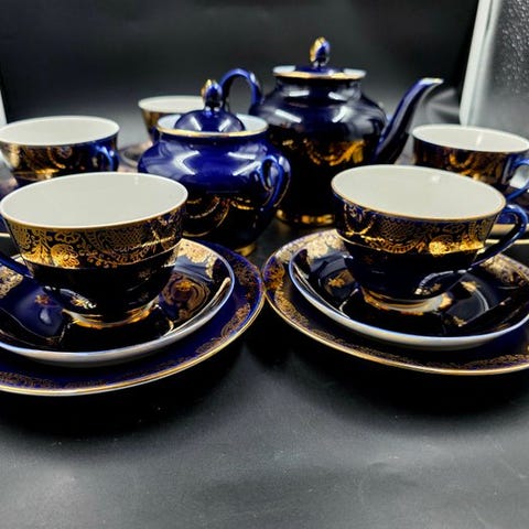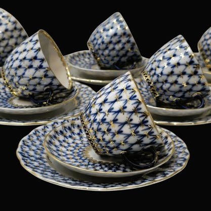 Originale stykker fra 1970’erne–1980’erne — et luksuriøst og historisk eksempel på det sene sovjetiske kejsersk porcelænsfremstilling.