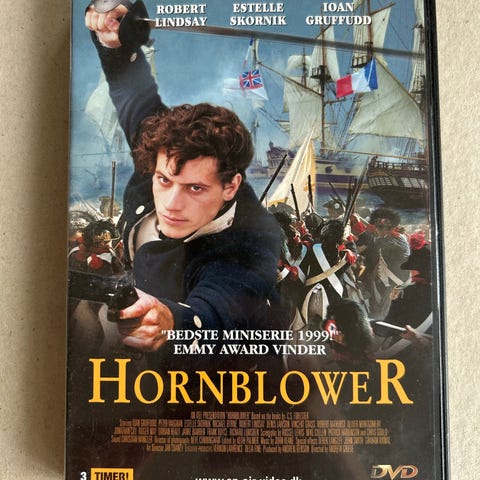 Hornblower dvd-boks med samlet spilletid på 13 timer. Boksen indeholder flere dvd-diske med tv-serien om søofficeren Hornblower. Omslaget viser skibe i søslag og angiver, at der er tale om en længerevarende serieproduktion. Velegnet til afspilning på dvd-afspillere, der understøtter standard dvd-format.