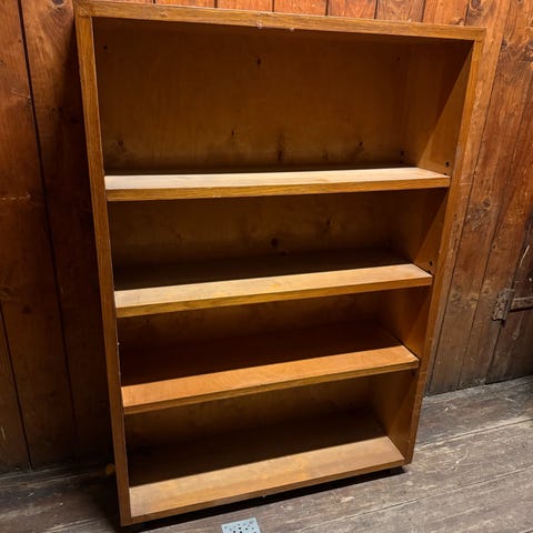 Reol i brunt træ med tre åbne hylder. Klassisk, rektangulær model med dekorative detaljer på forstolperne. Egnet til opbevaring af bøger, dekoration eller andre genstande i stue, kontor eller værelse. Overfladen fremstår med synlige brugsspor efter almindelig anvendelse.