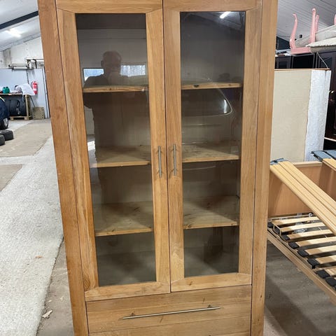 Sælger grundet flytning dette store fine vitrineskab med masser af plads til opbevaring. Der er på midterste hylde et lille hul i bagvæggen, ( brugt til kabel til printer ). Der er lys på de to øverste hylder.