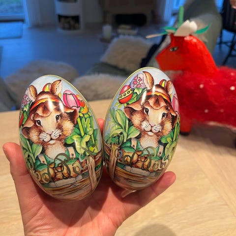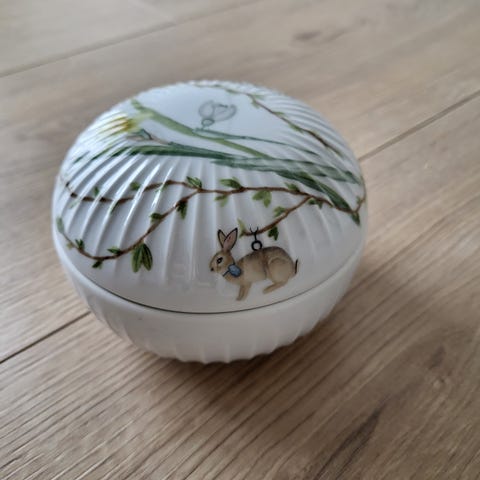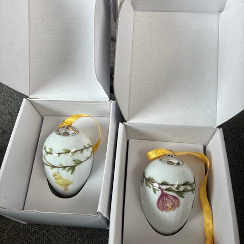 Kähler Hammershøi påskeophæng æg i porcelæn. Sættet består af tre hvide ægformede ophæng med gule silkebånd. Æggene har forskellige påskemotiver i afdæmpede farver. Velegnet som påskepynt til ophæng på grene, i vindue eller andre dekorationer i hjemmet i påsken.