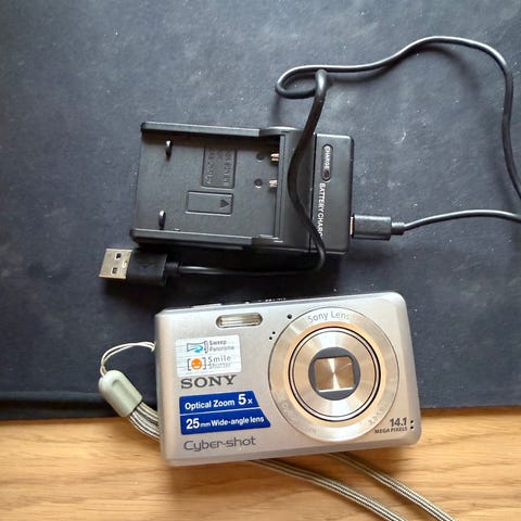 Sony digitalkamera i hvid farve. Kameraet har udskifteligt objektiv, indbygget skærm der kan vippes op, samt skulderrem. Medfølgende oplader og strømadapter fremgår af billederne. Velegnet til generel foto- og videooptagelse.