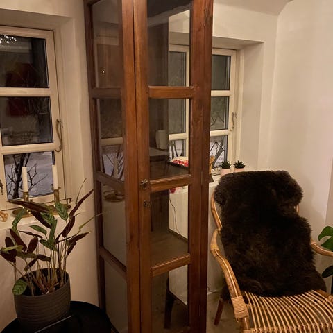 Fint gammelt vitrine skab. Der er en revne i foden (se billede 4), men det er uden betydning