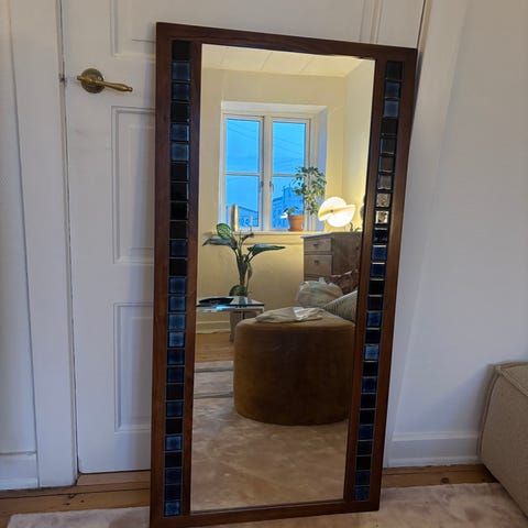 IKEA fritstående spejl med træramme. Spejlet er højt og smalt og egner sig til brug som helkropsspejl i fx soveværelse, entré eller garderobe. Rammen er udført i lyst træ, og spejlet står på et integreret stativ, så det kan placeres frit på gulvet uden ophæng.