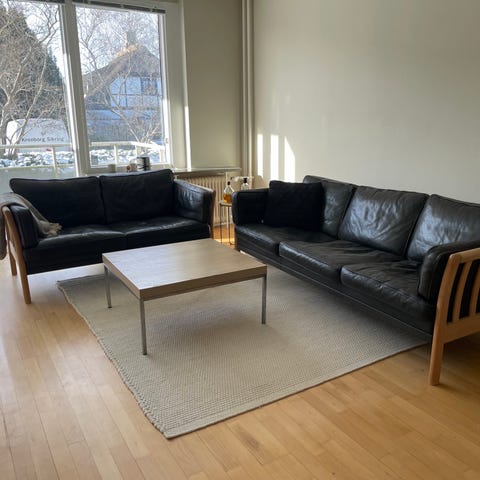 Hent hurtigt. To sofaer i læderlook til hhv. to og tre personer, et sofabord samt tæppe. Billede og lampe er ikke til salg.