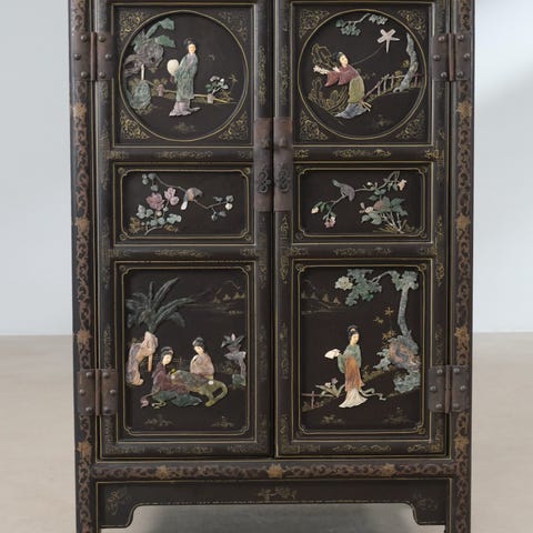 Smukt og dekorativt kinesisk kabinet i sort lak med rigt udsmykkede håndlavede reliefpaneler udført med indlæg. Skabet er dekoreret med detaljerede orientalske motiver, hvor figurer, fugle, blomster og landskaber er udført i fin stenincrustation – en klassisk kinesisk dekorationsform.