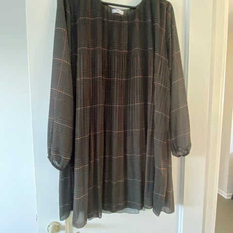 Der er desværre ingen mærker i, men mit gæt er, at det er en str. 38 eller M. og at materialet er polyester.