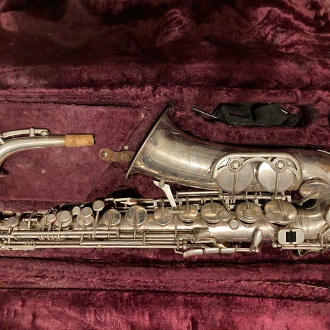 Gl skøn jazzmusiker skulptur figur m saxofon jazz musik og lysestage