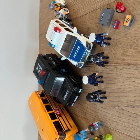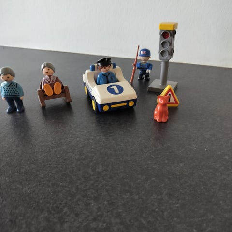 Vintage Playmobil racerkører med andre mennesker, bl.a. kameramand og førstehjælp med båret