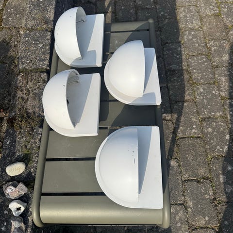 10 stk Louis Poulsen væglamper til udendørs brug hvid farve. Kaldes Light Point Rørhat. Lamperne er udført som en kvadratisk vægmonteret enhed med halvkugleformet skærm, der giver nedadrettet lys. Skal afmonteres fra væg og have nye monteringsskruer. Nypris ca. 1.995,-. Sælges samlet for 3.000,- eller stykvis for 500,-