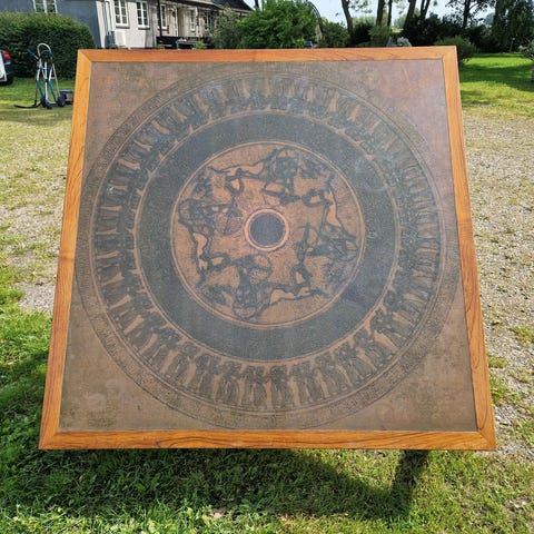 Sofabord med kobber bordplade, kvadratisk bordplade og . Bordpladen har et detaljeret, cirkulært mønster i overfladen, der kan minde om et kalender- eller symbolmotiv. Stellet er i træ med slanke ben og metalbeslag ved hjørnerne.