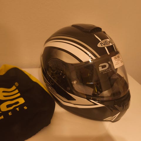 Nexx motorcykelhjelm i sort med klart ydre visir og indvendigt solvisir. Hjelmen har fuld ansigtsdækning, integrerede ventilationsåbninger og polstret inderfor. Justerbar hagerem med kliklås. Leveres med opbevaringspose som vist på billederne.