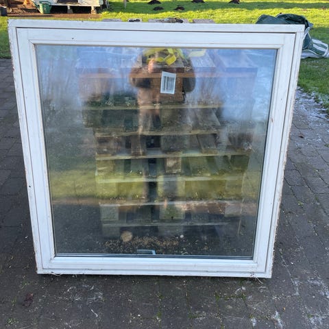 9 vinduer i et bud. De 8 er med klar glas og 1 med matteret glas de måler 125 cm I Bredden og 126 cm I Højden. Der 8 er med håndtag i bunden og 1 med håndtag i siderne. De 8 er god stand det 1 er med dårlig ramme. Sælges kun samlet