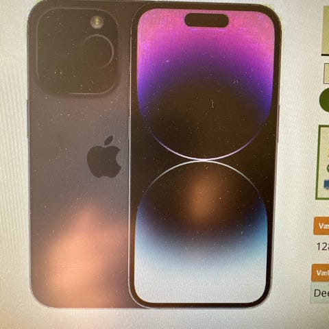 Apple iPhone 14 Pro Max smartphone med 128 GB intern hukommelse. Modellen har stor skærm og tredobbelt kamera på bagsiden. Farven fremstår som sølv/lys. Velegnet til almindelig brug, apps, streaming og lagring af billeder og video. Lille ridse på bagsiden - derfor prisen.