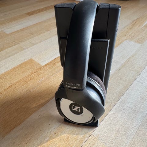 Sennheiser HDR 110 II trådløse over-ear hovedtelefoner i sort. Modellen er et trådløst sæt, der leveres med tilhørende sender/baseenhed og strømforsyning, som ses på billederne. Hovedtelefonerne har lukkede ørekopper med polstrede puder og justerbar hovedbøjle med Sennheiser-logo. På ørekoppen sidder betjeningsknapper og kontakt til tænd/sluk og justering. Velegnet til trådløs lytning fra kompatible lydkilder i hjemmet, f.eks. tv eller stereoanlæg, via den medfølgende senderenhed.