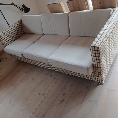 Fin sofa betrukket med hestedækken i rødbrun/mørkeblå. Den er godt brugt, men alderen taget i betragtning er den i god stand. Enkelte små pletter på siddehynderne. Se foto.