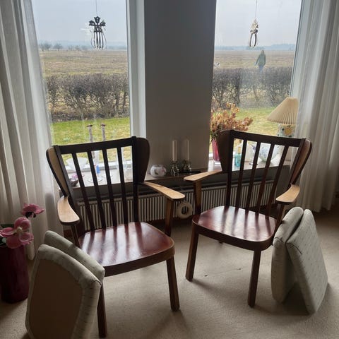 Canada stolen fra Fritz Hansen med røde velourhynder. Stolen er helt stabil, en knækket pind ved den ene skrue, men uden betydning.