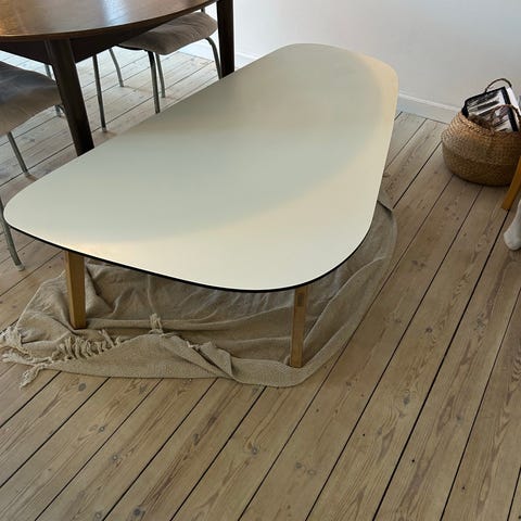 Meget nem vedligeholdelse. Der er nogle mindre "rander" i et hjørne af bordpladen som nemt kan slibes væk og olieres på ny (se foto).