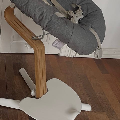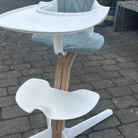 Stokke Noma højstol i hvid med ege stel Højstolen har fodplade og sæde i hvidt materiale samt buet træstamme. Egnet som spise- og siddeplads til børn ved bordet. Designet giver støtte til barnets fødder og siddestilling. Kan bruges i køkken eller spisestue som funktionel børnestol.