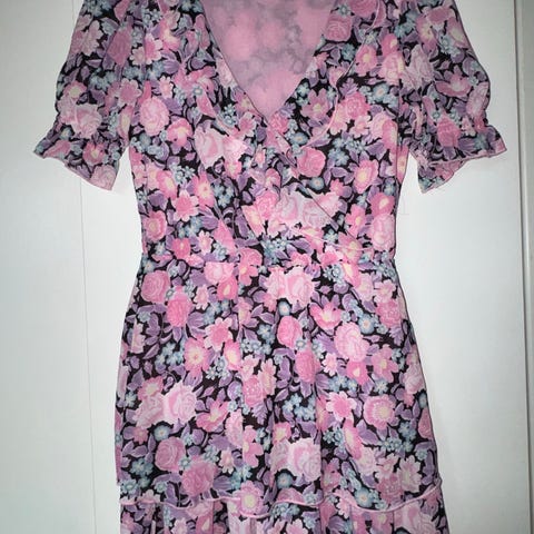 H&M sommerkjole til kvinder i størrelse XL. Kjolen er multifarvet med blomstret mønster og fremstillet i polyester. Modellen har korte, lette ærmer og V-udskæring samt indsnit i taljen for en mere markeret pasform. Længden går cirka til anklerne, afhængigt af højde. Egnet som sommerkjole til hverdag eller mere afslappede anledninger.