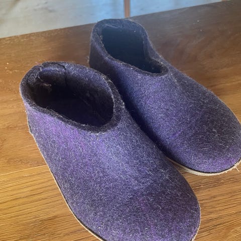 Glerups hjemmesko i størrelse 22 og fin stand. Filtet støvle af 100% ren, naturlig uld i farven rød med elastiksnøre. Indersålen er målt til 13,5cm.