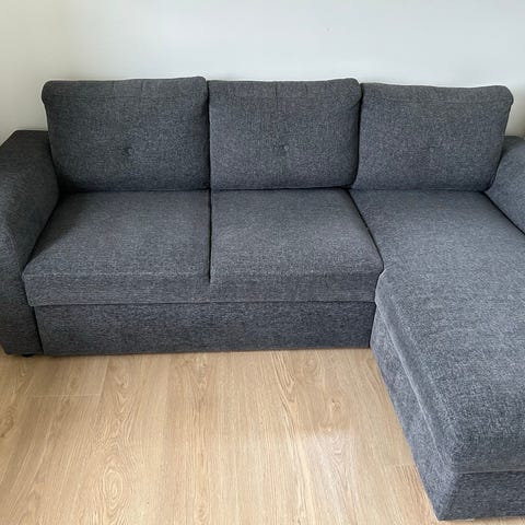 Sovesofa i hjørnesofa-udformning i gråt stof. Sofaen har chaiselong i højre side (set forfra) og tre ryghynder. Den kan trækkes ud til sovefunktion, så hele siddefladen bliver til en liggeflade. Velegnet som kombineret sofa og seng i stue, gæsteværelse eller mindre bolig. Mål fremgår af et af billederne med angivelse på ca. 2,34 m i længden.
