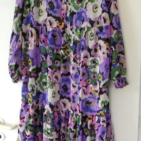 Den er sort i bundfarve med et smukt print over det hele i orange og pink.