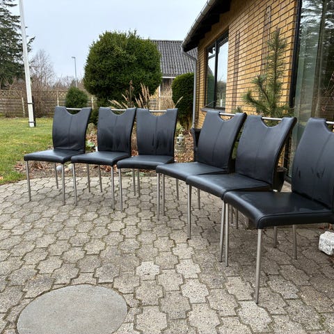 4 spisestole i sort læder og krom. Den ene med løst armlæn, som dog ikke betyder noget når man sidder i den, så den følger gratis med. Man sidder fantastisk godt i dem, men jeg har ikke plads til opbevaring.