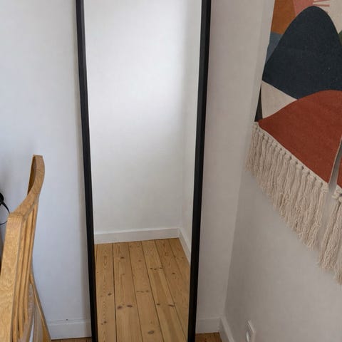 IKEA spejl med sort ramme. Rektangulært vægspejl med markant, profileret topkant. Velegnet til brug i soveværelse, entré eller stue som helkropsspejl eller dekorativt vægspejl.