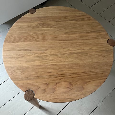 Stine Weigelt har tidligere skabt en pindestol til FDB Møbler. I forlængelse har hun skabt sofaborde og en skammel, der bærer den århusianske designers umiskendelige signatur. Lige som stolen har skamlen og sofabordet tre ben samt den fine lille detalje, hvor den øverste ende af benet møder bordkanten og danner en lille tangerende cirkel. Sofabordet findes i forskellige størrelser, og fungerer sammen som indskudsborde. Når man skal have lidt mere bordplads foran sofaen, kan et ekstra bord nemt findes frem. Bordet er designet til dagligt brug i hjemmet. Med den rette pleje kan dette bord holde mange år frem i tiden. Bordet er fremstillet i massivt egetræ. Egetræ er et naturmateriale, og der vil derfor være naturlige variationer i bordets overflade. Dette gør bordet unikt. Der vil aldrig være to borde som er helt ens.
