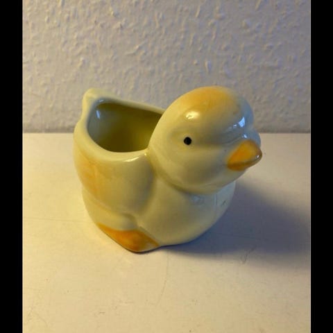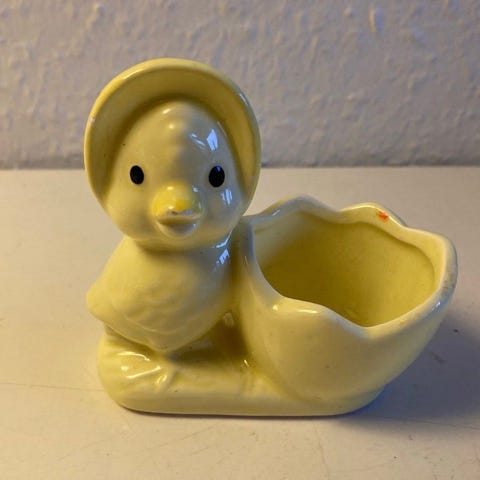 Flirtende ældre gul påskeKylling i keramik med sin æggeskal til små påskeæg eller vintergækker