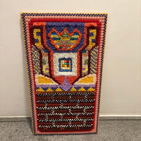 Virkelig fint håndlavet vægtæppe eller billedtæppe. Motivet er en bondegård eller i hvert fald et landskab med marker og dyr.