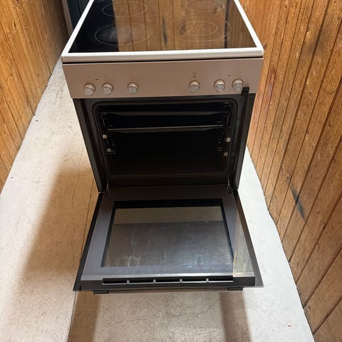 Bosch keramisk komfur med glaskeramisk kogeplade og fire kogezoner. Komfuret har integreret ovn med glaslåge og mekaniske drejeknapper til betjening af både kogeplade og ovn. Velegnet til almindelig madlavning og bagning i køkkenet.