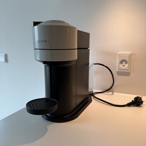 Nespresso Vertuo Next kapselkaffemaskine i sort. Maskinen anvender Nespresso Vertuo-kapsler, som indsættes i det øverste kammer. På siden findes en aftagelig vandtank. Maskinen er velegnet til brygning af forskellige kaffetyper og -størrelser afhængigt af kapselvalg. Strømtilslutning sker via medfølgende netledning med stik. Maskinen er egnet til brug i køkken på bordplade og kræver Nespresso Vertuo-kompatible kapsler for drift.