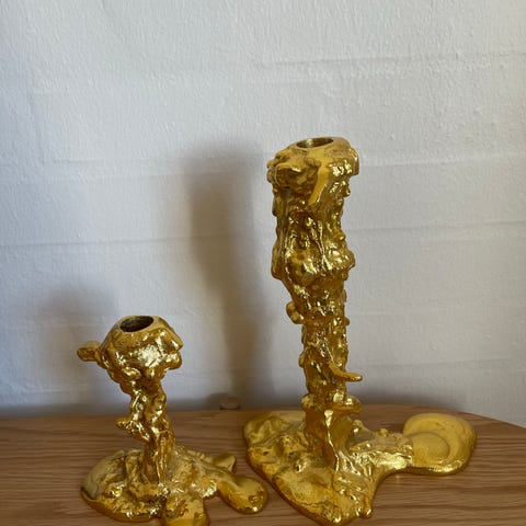 2 stk Polspotten drip lysestager, guldfarvet. Str S og L.