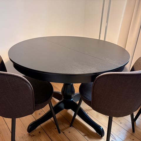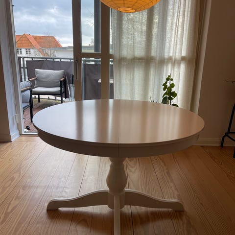 IKEA INGATORP hvidt spisebord. Bordet er 110 cm i diameter og er med plade (der ligger i bordet) 1,55 cm langt. Højden er 74 cm. Bordet står som nyt uden ridser eller andre brugsspor. Det har kun stået i røgfrit og dyrefrit hjem.