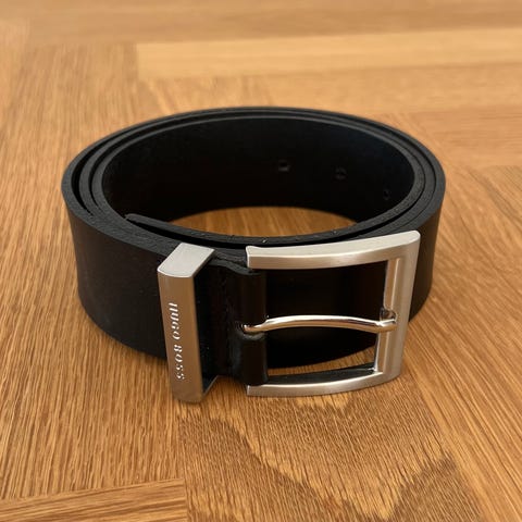 Hans Øster bælte til mand i mørkbrunt læder. Bæltet har klassisk spænde i metal og syninger langs kanten. Indvendigt er det mærket med størrelsen 90 og modelnummer 342. Egnet til brug i bukser til hverdag eller mere formelle anledninger. Spændet er lidt afskallet