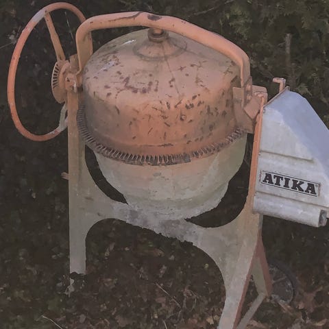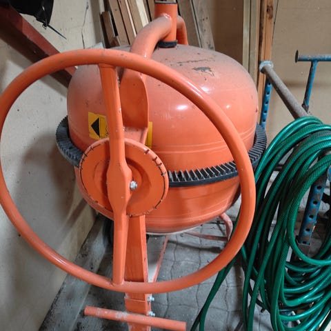 Lescha VM 140 S betonblander i orange farve. Tromle monteret på stativ med hjul og håndtag til vipning af tromlen. Egnet til blanding af beton, mørtel og lignende materialer på byggeplads eller ved renoveringsopgaver. Drevet af elektrisk motor, betjenes via kontrolboks på siden af maskinen.