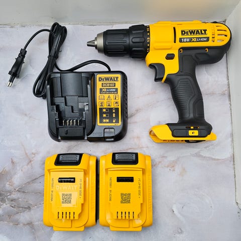 DeWalt akku boremaskine i gul/sort med tilhørende plastkuffert. Sættet indeholder boremaskine, lader og flere genopladelige batterier, som ses på billedet. Velegnet til almindelige bore- og skrueopgaver i hjemmet eller på værkstedet. Maskinen har ergonomisk greb og kompakt design, som gør den egnet til arbejde på trange steder. Leveres samlet i kufferten for nem opbevaring og transport.