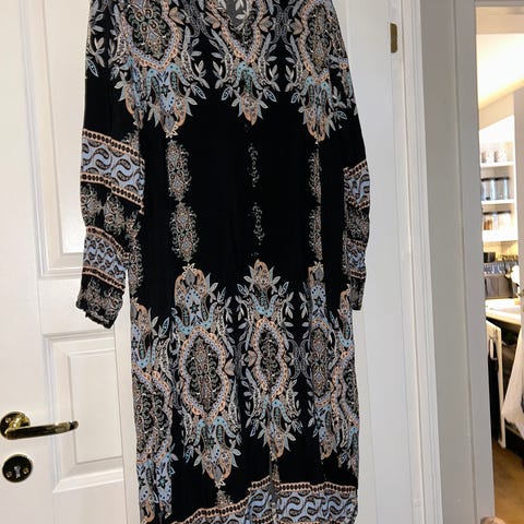 Størrelsen siger S/M, men den er nærmere en L/XL. Har brugt den en enkelt gang, men jeg er gået ned i str. så den er for stor til mig. Den er blød og lækker at have på, stoffet falder rigtig godt, og så er den flot at se på, den skinner i stoffet 😊