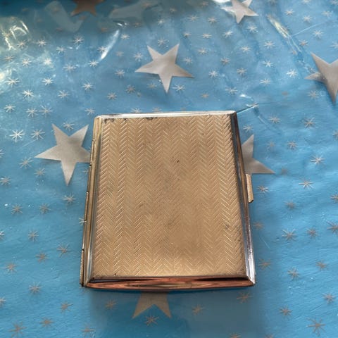 Metalletui cigaretetui i sølvfarvet metal. Etuiet har hængslet åbning og indvendig holderem til cigaretter eller lignende genstande. Egnet til opbevaring og transport i lomme eller taske. Overfladen fremstår med tydelige brugsspor og patina.