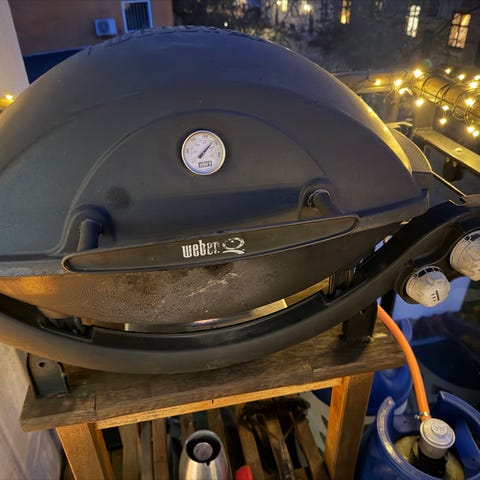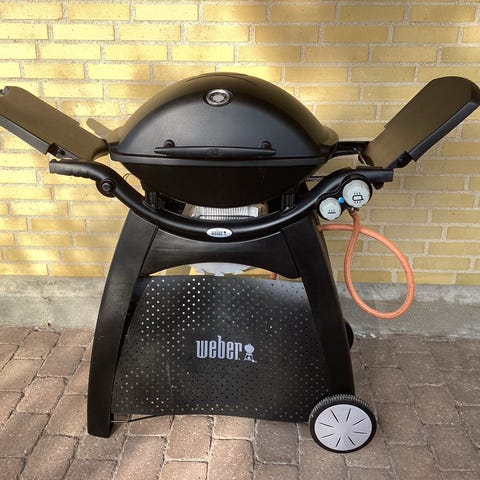 Weber Q 3200 gasgrill i sort. Grillen har låg med indbygget termometer og grillrist i støbejern. Den står på vogn med hjul og sideborde, som kan klappes ned.