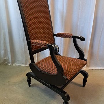 Træ rokkestol med tilhørende skammel. Stolen har drejede trædetaljer på ben, armlæn og ryg. Sæde og ryg er polstret med ternet stof i lyse nuancer. Skamlen er ligeledes polstret i samme ternede stof. Egnet som lænestol eller hvilestol i stue, læsehjørne eller lignende rum. Stolen skal afhentes på adr Kbh N og betales kontant eller mobil pay. Hilsen Per