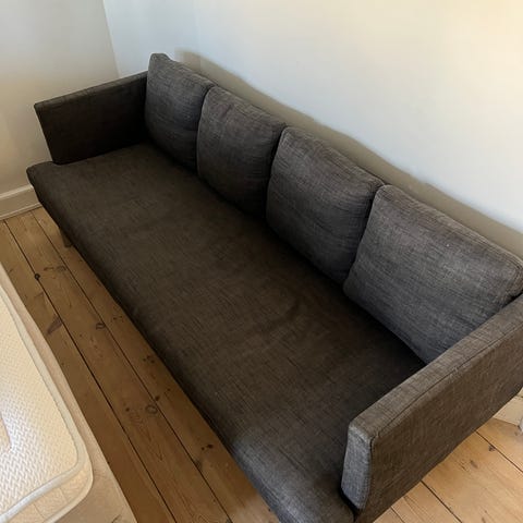 Enkel, pæn, ren mørkegrå sofa.